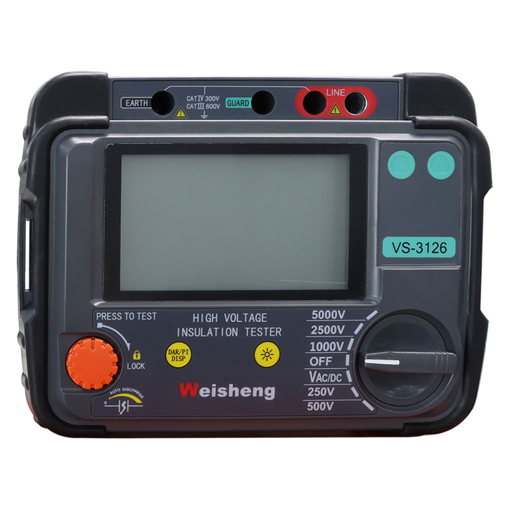 Weshine® VS-3126 عبارة عن بطارية تعمل بالبطاريةجهاز اختبار عزل الجهد العاليمع شاشة عرض قوسية رقمية وتناظرية، مصممة لاختبار مقاومة عزل الجهد العالي في صيانة وخدمة الكابلات وآلات المصانع الدوارة والمحولات والمفاتيح الكهربائية والتطبيقات الصناعية.